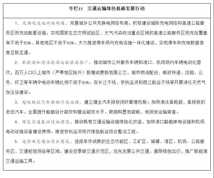 新能源和清潔能源運輸裝備推廣。推動城市公共服務(wù)車輛和港口、機場場內(nèi)車輛電動化替代,百萬人口以上城市(嚴寒地區(qū)除外)新增或更新地面公交、城市物流配送、郵政快遞、出租、公務(wù)、環(huán)衛(wèi)等車輛中電動車輛比例不低于80%。在長江干線、京杭運河和西江航運干線等開展液化天然氣加注站建設(shè)。