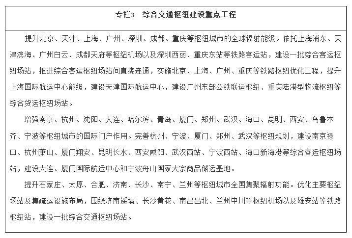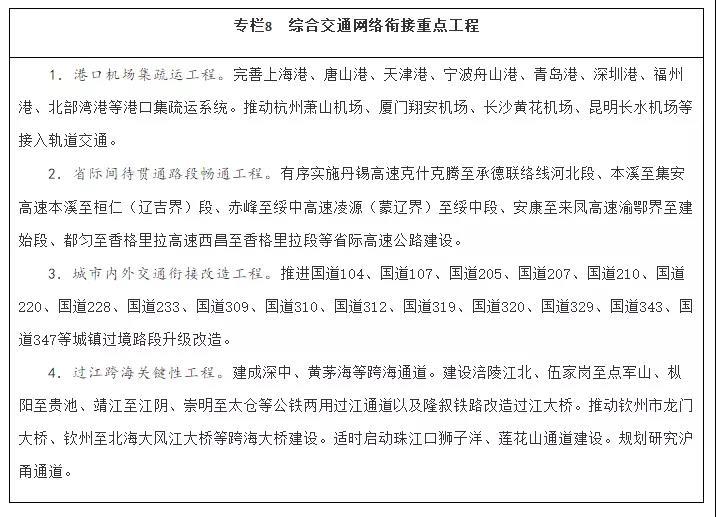 建設(shè)多節(jié)點、網(wǎng)格狀、全覆蓋的京津冀一體化綜合交通網(wǎng)絡(luò),基本建成軌道上的京津冀,高標(biāo)準、高質(zhì)量打造雄安新區(qū)對外交通網(wǎng)絡(luò),加強北京城市副中心與中心城區(qū)、廊坊北三縣交通基礎(chǔ)設(shè)施互聯(lián)互通,強化北京冬奧會、冬殘奧會交通保障。依托長江黃金水道,整體設(shè)計推進長江經(jīng)濟帶綜合交通運輸體系建設(shè),補強沿江高鐵和鐵路貨運能力,全力打通公路省際待貫通路段,提升江海聯(lián)運、鐵水聯(lián)運發(fā)展水平。推進粵港澳大灣區(qū)基礎(chǔ)設(shè)施互聯(lián)互通,優(yōu)化航運和航空資源配置,加強港澳與內(nèi)地的交通聯(lián)系,支持香港提升國際航運、國際航空樞紐地位。推動長三角地區(qū)交通運輸更高質(zhì)量一體化發(fā)展,加快對外交通、城際交通、都市圈交通高效銜接和有機融合,協(xié)同推進港航、海事一體化發(fā)展,推動上海市、江蘇省、浙江省、安徽省共建輻射全球的航運樞紐,加快提升江蘇通州灣江海聯(lián)動示范區(qū)功能,打造長江集裝箱運輸新出??凇?gòu)建海南島內(nèi)暢通、陸島連通、全球通達的現(xiàn)代綜合交通運輸體系,建設(shè)現(xiàn)代化綜合交通樞紐,穩(wěn)步推進自由貿(mào)易港建設(shè)。構(gòu)建黃河流域綠色安全便捷綜合交通網(wǎng)絡(luò),強化跨區(qū)域大通道建設(shè)。