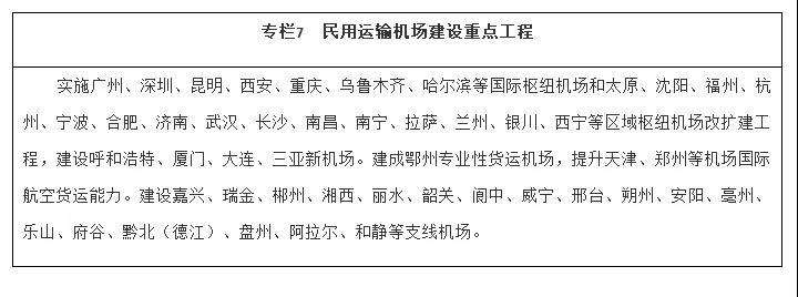 擴大航空網(wǎng)絡(luò)覆蓋。推動區(qū)域機場群協(xié)同發(fā)展,建設(shè)京津冀、長三角、粵港澳大灣區(qū)、成渝等世界級機場群。適時啟動能力緊張樞紐機場改擴建工程,強化樞紐機場綜合保障能力。合理加密機場布局,穩(wěn)步建設(shè)支線機場和專業(yè)性貨運樞紐機場,提升綜合性機場貨運能力和利用率。有序推進通用機場規(guī)劃建設(shè),構(gòu)建區(qū)域短途運輸網(wǎng)絡(luò),探索通用航空與低空旅游、應(yīng)急救援、醫(yī)療救護、警務(wù)航空等融合發(fā)展。優(yōu)化航路航線網(wǎng)絡(luò),加強軍民航空管基礎(chǔ)設(shè)施建設(shè),推廣應(yīng)用空管新技術(shù)。