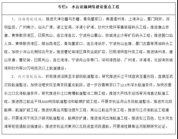 優(yōu)化暢通水運設(shè)施網(wǎng)絡(luò)。建設(shè)京津冀、長三角、粵港澳大灣區(qū)世界級港口群,支持山東打造世界一流的海洋港口,推進東北地區(qū)沿海港口一體化發(fā)展,優(yōu)化港口功能布局,推動資源整合和共享共用。有序推進沿海港口專業(yè)化碼頭及進出港航道等公共設(shè)施建設(shè)。適度超前建設(shè)糧食、能源、礦產(chǎn)資源的接卸、儲存、中轉(zhuǎn)設(shè)施,推進沿海沿江液化天然氣碼頭規(guī)劃建設(shè)。提升內(nèi)河港口專業(yè)化、規(guī)?;?,合理集中布局集裝箱、煤炭、鐵礦石、商品汽車等專業(yè)化碼頭。加強內(nèi)河高等級航道擴能升級與暢通攻堅建設(shè),完善長江、珠江、京杭運河和淮河等水系內(nèi)河高等級航道網(wǎng)絡(luò),進一步提升珠三角高等級航道網(wǎng)出海能力,全面加強長三角、珠江—西江高等級航道網(wǎng)未達標(biāo)段建設(shè)。推動重要支流航道和庫湖區(qū)航道、內(nèi)河旅游航道、便民碼頭建設(shè)。