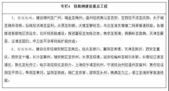 建設(shè)現(xiàn)代化鐵路網(wǎng)。堅持客貨并重、新建改建并舉、高速普速協(xié)調(diào)發(fā)展,加快普速鐵路建設(shè)和既有鐵路擴能改造,著力消除干線瓶頸,推進既有鐵路運能緊張路段能力補強,加快提高中西部地區(qū)鐵路網(wǎng)覆蓋水平。加強資源富集區(qū)、人口相對密集脫貧地區(qū)的開發(fā)性鐵路和支線鐵路建設(shè)。推進高速鐵路主通道建設(shè),提升沿江、沿海、呼南、京昆等重要通道以及京滬高鐵輔助通道運輸能力,有序建設(shè)區(qū)域連接線。綜合運用新技術(shù)手段,改革創(chuàng)新經(jīng)營管理模式,提高鐵路網(wǎng)整體運營效率。統(tǒng)籌考慮運輸需求和效益,合理規(guī)劃建設(shè)鐵路項目,嚴控高速鐵路平行線路建設(shè)。