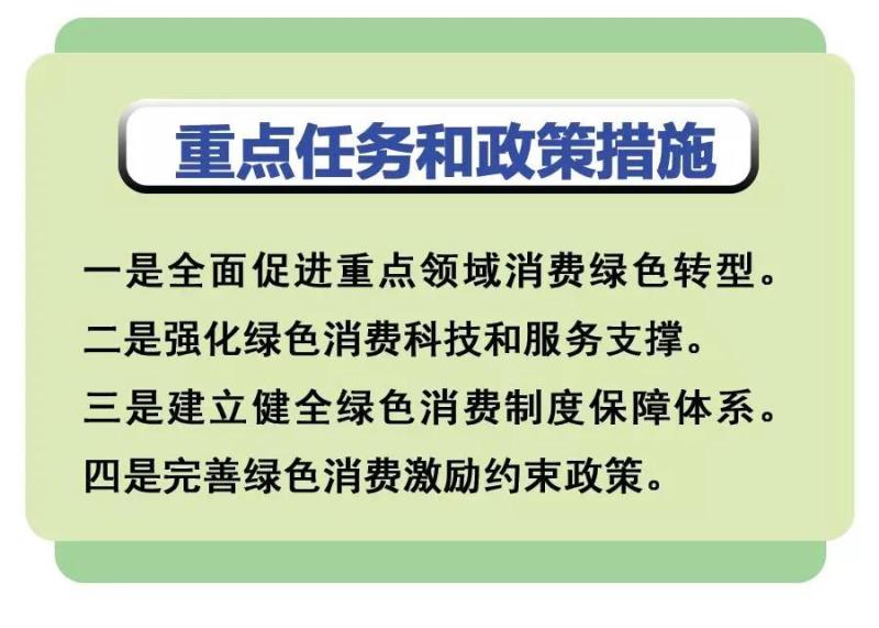 《實(shí)施方案》按照目標(biāo)導(dǎo)向和問(wèn)題導(dǎo)向的要求,對(duì)促進(jìn)綠色消費(fèi)的制度政策體系進(jìn)行了系統(tǒng)設(shè)計(jì),提出四個(gè)方面的重點(diǎn)任務(wù)和政策措施。一是全面促進(jìn)重點(diǎn)領(lǐng)域消費(fèi)綠色轉(zhuǎn)型。加快提升食品消費(fèi)綠色化水平,鼓勵(lì)推行綠色衣著消費(fèi),積極推廣綠色居住消費(fèi),大力發(fā)展綠色交通消費(fèi),全面促進(jìn)綠色用品消費(fèi),有序引導(dǎo)文化和旅游領(lǐng)域綠色消費(fèi),進(jìn)一步激發(fā)全社會(huì)綠色電力消費(fèi)潛力,大力推進(jìn)公共機(jī)構(gòu)消費(fèi)綠色轉(zhuǎn)型。二是強(qiáng)化綠色消費(fèi)科技和服務(wù)支撐。推廣應(yīng)用先進(jìn)綠色低碳技術(shù),推動(dòng)產(chǎn)供銷全鏈條銜接暢通,加快發(fā)展綠色物流配送,拓寬閑置資源共享利用和二手交易渠道,構(gòu)建廢舊物資循環(huán)利用體系。三是建立健全綠色消費(fèi)制度保障體系。加快健全法律制度,優(yōu)化完善標(biāo)準(zhǔn)認(rèn)證體系,探索建立統(tǒng)計(jì)監(jiān)測(cè)評(píng)價(jià)體系,推動(dòng)建立綠色消費(fèi)信息平臺(tái)。四是完善綠色消費(fèi)激勵(lì)約束政策。增強(qiáng)財(cái)政支持精準(zhǔn)性,加大金融支持力度,充分發(fā)揮價(jià)格機(jī)制作用,推廣更多市場(chǎng)化激勵(lì)措施,強(qiáng)化對(duì)違法違規(guī)等行為處罰約束。
