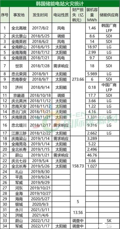 相關數據顯示,自2017年至今,韓國國內已經發(fā)生儲能系統(tǒng)火災超34起,涉事電池企業(yè)包括LG新能源、三星SDI和其它電池企業(yè)。有多數事故裝置的是LG化學生產的鋰電池。