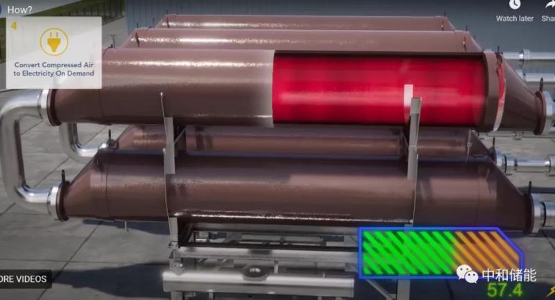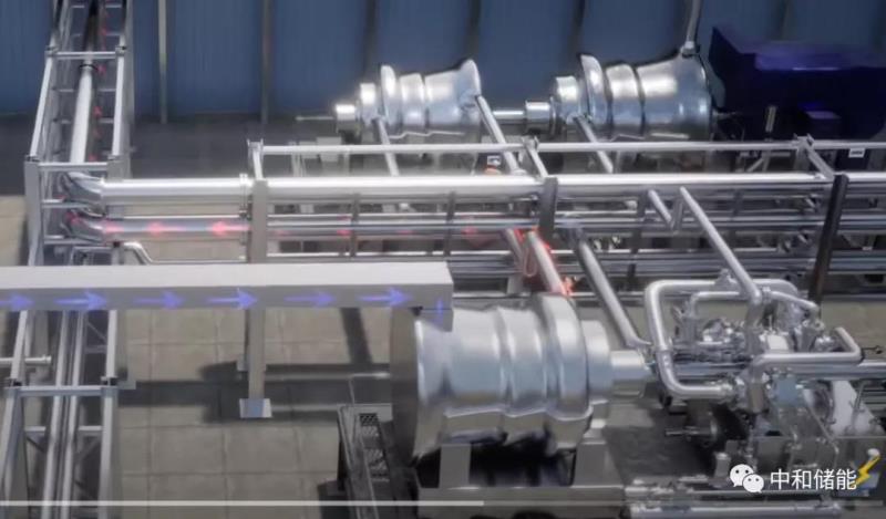 在氣體回到地面進(jìn)入壓縮機(jī)之前,會(huì)先與儲(chǔ)存熱量的水進(jìn)行熱交換,氣體溫度變高,可以膨脹得更加厲害,發(fā)出更多的電。