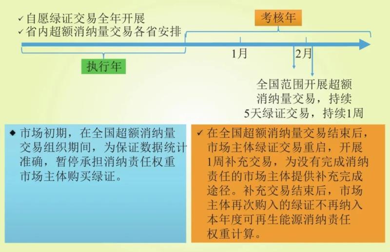 在市場(chǎng)運(yùn)行初期,原則上只開展年度交易,每年一月中旬結(jié)算工作完成后組織開展上年度超額消納量交易;市場(chǎng)成熟后可逐步開展季度、月度或日交易。各省級(jí)政府可根據(jù)情況確定本地區(qū)省內(nèi)交易周期,但需要與全國(guó)交易保持銜接。