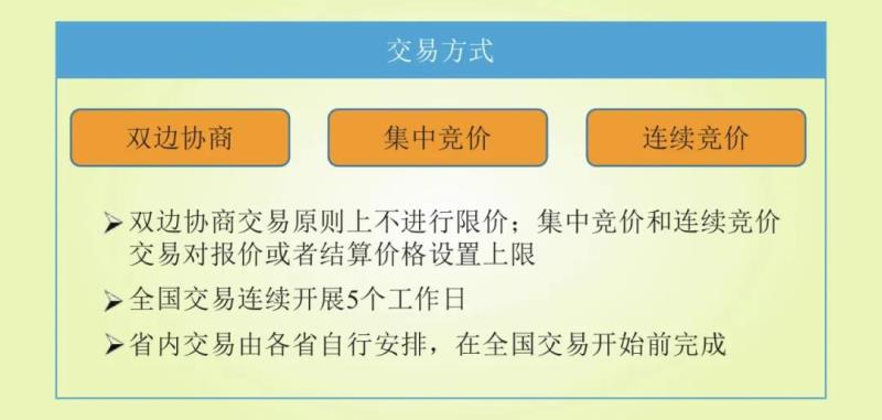 其中,全國(guó)交易方式包括雙邊交易、集中競(jìng)價(jià)和連續(xù)競(jìng)價(jià)交易,連續(xù)開展5個(gè)工作日。每工作日09:00—17:00開展雙邊協(xié)商交易;每工作日上午09:00—9:30開展集中競(jìng)價(jià)交易,09:30—17:00開展連續(xù)競(jìng)價(jià)交易,集中競(jìng)價(jià)交易階段未成交部分的消納量自動(dòng)進(jìn)入連續(xù)競(jìng)價(jià)交易階段。省內(nèi)交易的交易方式由各省自行安排,在全國(guó)交易開始前完成。