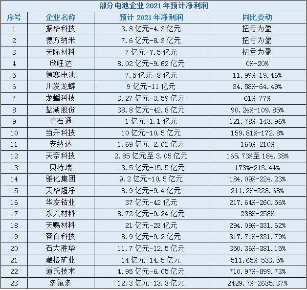 同樣因為六氟磷酸鋰產(chǎn)品產(chǎn)銷量大幅增長,以及市場對六氟磷酸鋰的需求大增,導致六氟磷酸鋰市場銷售價格上漲,天際材料實現(xiàn)扭虧為盈。此外,德方納米、振華科技也在去年實現(xiàn)扭虧為盈。