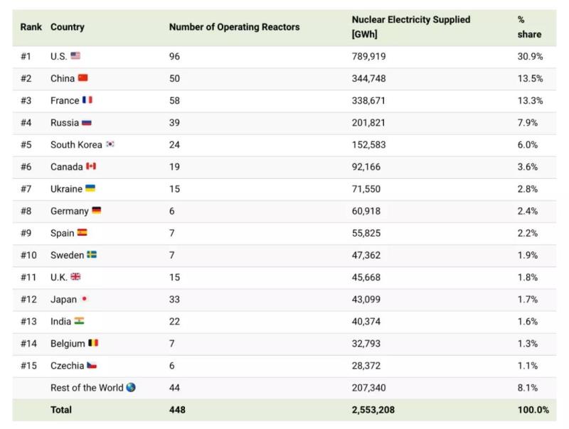 有趣的是,從絕對值來看,這些國家中只有少數(shù)躋身于世界前列。例如斯洛伐克,核能占電力結(jié)構(gòu)的53.6%,但該國的四個反應(yīng)堆占全球總運行容量的不到1%。另一方面,盡管2020年美國的核電產(chǎn)量占全球核電產(chǎn)量的31%,但美國在核電總量中所占的份額卻排在第17位。這種差異很大程度上是由于面積和人口造成的。歐洲國家比美國和中國等大國小得多,總的來說發(fā)電量也少。