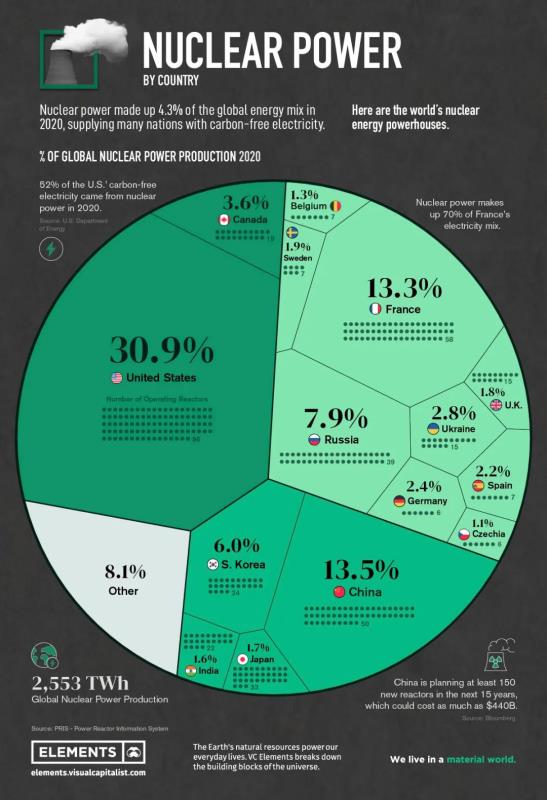 中國儲能網(wǎng)訊:VirtualCapitalist網(wǎng)站發(fā)布全球核能信息圖。2020年全世界共有448座核電機組,發(fā)電量約占總量的10%,全球一次能源消費的4.3%。但是,盡管一些國家正在發(fā)展核能,但核能發(fā)電總體上自20世紀90年代達到頂峰以來有所放緩。前15個核電國家占全球核電產(chǎn)量的91%以上。