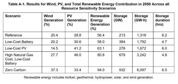 如上表 A-1 所述,參考情景也包括大量風能和太陽能——分別占美國全部電力的20.4%和28.8%。