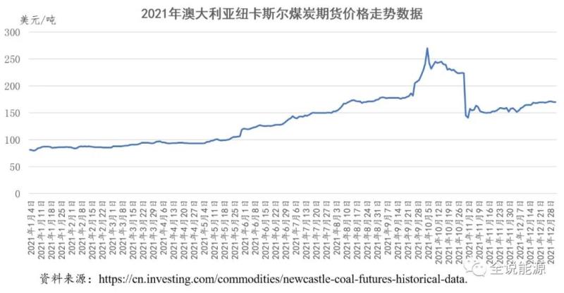 澳大利亞紐卡斯?fàn)?021年煤炭期貨價格均價為每噸136.68美元,最高價為每噸269.50美元,最低價為每噸79.30美元,高低價差達(dá)每噸190.20美元。1月4日,澳煤的開盤價為每噸82.50美元,以2021年10月5日的最高價269.50美元計算,上漲了3.27倍;以12月31日的收盤價169.90美元計算,上漲了2.06倍。