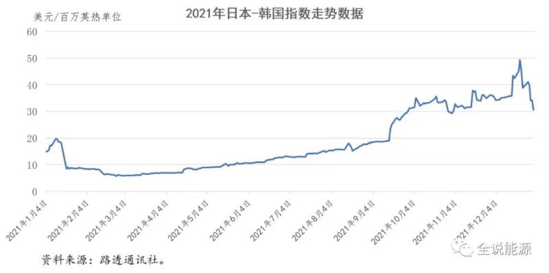 日韓指數(shù)2021年均價為每百萬英熱單位18美元。1月4日,日韓指數(shù)的開盤價為每百萬英熱單位14.93美元,12月31日的收盤價為30.50美元,2021年日韓指數(shù)上漲了15.57美元,上漲了2.04倍;以12月21日的最高價計算,日韓指數(shù)上漲了34.42美元,上漲了3.3倍。以2月25日的每百萬英熱單位5.81美元的最低價計算,高低價差達(dá)43.54美元。