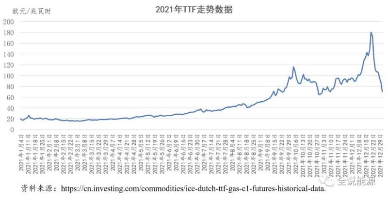 從2021年全年看,TTF的均價為47.846歐元/兆瓦時,最高價是12月21日出現(xiàn)的,為187.785歐元/兆瓦時,最低價出現(xiàn)在3月3日,為15.485歐元/兆瓦時,高低價差為172.3歐元/兆瓦時;1月4日,TTF的開盤價為19.20歐元/兆瓦,2021年TTF最高價上漲了9.78倍;以12月31日70.340歐元/兆瓦時的收盤價計算,2021年全年TTF上漲了51.24歐元/兆瓦時,上漲了3.66倍。