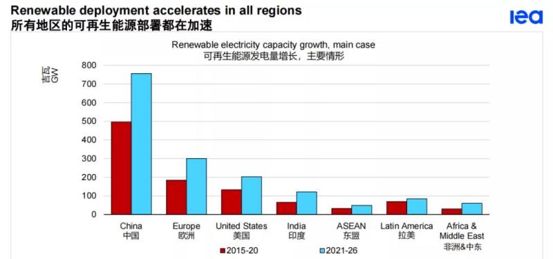 總的來說,中國在未來五年內(nèi)仍然是領(lǐng)導(dǎo)者,占全球可再生能源容量增長的43%,其次是歐洲、美國和印度。僅這四個(gè)市場就占了全球可再生能源容量擴(kuò)張的80%。