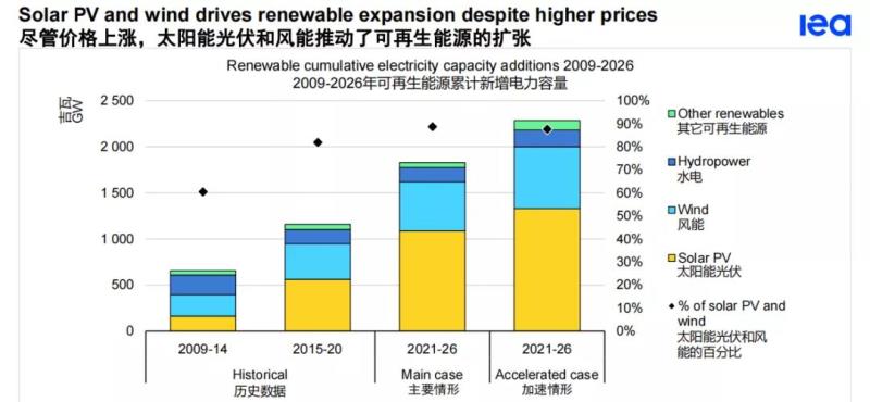 預(yù)計(jì)未來五年可再生能源容量的增長將加速,到2026年將占全球電力容量增長的近95%。我們已經(jīng)上調(diào)了一年前的預(yù)測,因?yàn)楦辛Φ恼咧С趾蜑镃OP26宣布的雄心勃勃的氣候目標(biāo)超過了目前創(chuàng)紀(jì)錄的商品價(jià)格,后者增加了建設(shè)新的風(fēng)能和太陽能光伏設(shè)施的成本。在全球范圍內(nèi),可再生能源發(fā)電量在2020年至2026年期間預(yù)計(jì)將增加60%以上,達(dá)到4800萬千瓦以上。這相當(dāng)于目前全球化石燃料和核能發(fā)電量的總和。