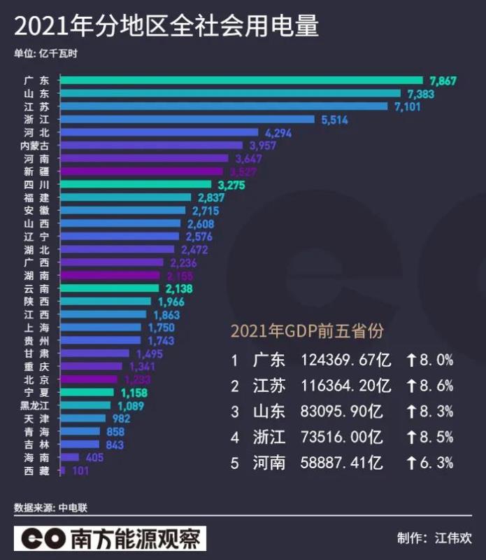 位居第三的山東省,2021年GDP為8.3萬億。值得一提的是,2020年山東用電量6940億千瓦時(shí),超過廣東成為全國第一。但在GDP方面,2020年廣東GDP 11萬億元,山東GDP則為7.3萬億。2021年,廣東用電量重回第一,7867億千瓦時(shí)。