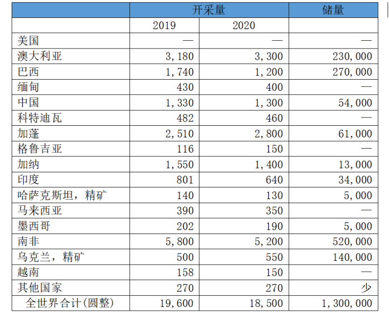 表4 世界錳資源開(kāi)采量與儲(chǔ)量(單位:千噸)資料來(lái)源:U.S. Geological Survey, Mineral Commodity Summaries, January 2021。