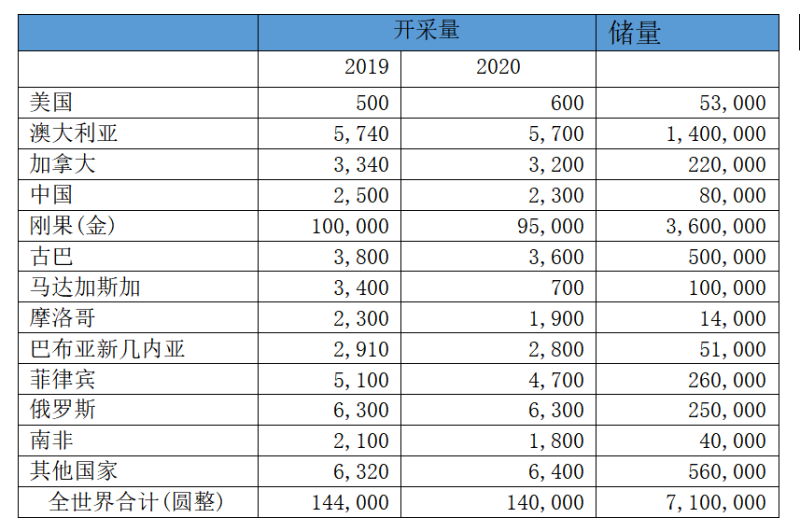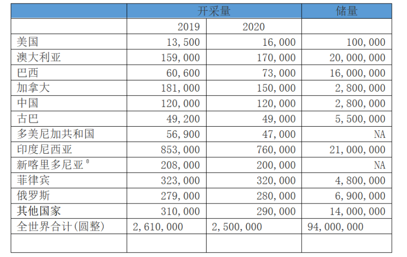 表3 世界鎳資源開(kāi)采量與儲(chǔ)量(單位:噸)資料來(lái)源:U.S. Geological Survey, Mineral Commodity Summaries, January 2021。