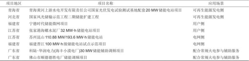 為推進(jìn)儲(chǔ)能項(xiàng)目由研發(fā)示范向商業(yè)化初期過(guò)渡,實(shí)現(xiàn)商業(yè)化初期向規(guī)模化發(fā)展的轉(zhuǎn)變,2020年國(guó)家發(fā)改委、能源局公布了首批科技創(chuàng)新(儲(chǔ)能)試點(diǎn)示范項(xiàng)目,主要對(duì)可再生能源發(fā)電側(cè)、用戶側(cè)、電網(wǎng)側(cè)、配合常規(guī)火電參與輔助服務(wù)等4個(gè)應(yīng)用領(lǐng)域共8個(gè)項(xiàng)目開展示范,項(xiàng)目名單見表4所示。