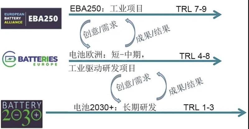 圖2 歐洲電池研究與創(chuàng)新生態(tài)系統(tǒng)-歐洲電池聯(lián)盟、電池歐洲技術(shù)與創(chuàng)新平臺(tái)和電池2030+之間的銜接互補(bǔ)