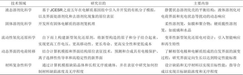 此外,DOE通過(guò)其下屬的先進(jìn)能源研究計(jì)劃署(ARPA-E)對(duì)儲(chǔ)能技術(shù)給予支持,2009—2019年共在13個(gè)研發(fā)計(jì)劃下開展了95個(gè)儲(chǔ)能相關(guān)的項(xiàng)目,包括:示范了一種用于液流電池的新型隔膜;在用Mg2+代替Li+的電池科學(xué)基礎(chǔ)方面取得了實(shí)質(zhì)性進(jìn)展;開發(fā)了計(jì)算工具,利用該工具篩選出了超過(guò)24000種潛在的電解質(zhì)和電極化合物,用于新的電池概念和化學(xué)品。2018—2022年,JCESR將在五個(gè)方向重點(diǎn)研究[10],包括:液體溶劑化科學(xué)、固體溶劑化科學(xué)、流動(dòng)性氧化還原科學(xué)、動(dòng)態(tài)界面的電荷轉(zhuǎn)移、材料復(fù)雜性科學(xué)(表2)