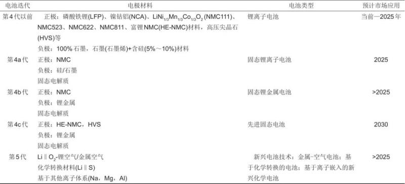 電化學(xué)儲(chǔ)能技術(shù)的發(fā)展歷程(圖1)最早起于1800年的伏打(Volta)電池和1836年的丹尼爾(Daniell)電池(也稱為鋅銅電池)。隨后,鉛/酸電池(1882年)、鎳/氫電池(1970年)和鋰電池(1990年)不斷涌現(xiàn),實(shí)現(xiàn)商業(yè)化應(yīng)用。但隨著電氣化、電網(wǎng)等大型應(yīng)用的發(fā)展,現(xiàn)已商業(yè)化的鋰離子電池一般采用有機(jī)電解液作為電解質(zhì),該電池存在漏液和易燃易爆問(wèn)題,且在高溫、大電流工作時(shí)鋰金屬負(fù)極在循環(huán)過(guò)程中易生成鋰枝晶造成電池短路,當(dāng)其用于大容量存儲(chǔ)時(shí)具有較大的安全隱患。此外,為解決電動(dòng)汽車中退役的電池組回收利用問(wèn)題,提出鋰離子電池梯次利用方案,即將報(bào)廢的車用鋰離子電池降級(jí)使用,繼續(xù)發(fā)揮余熱,但該方案具有較高的隱形成本以及再次降級(jí)應(yīng)用時(shí)與新儲(chǔ)能場(chǎng)景不適配的問(wèn)題。因此,目前商業(yè)化的鋰離子已不能完全滿足現(xiàn)階段能量存儲(chǔ)所要求的性能、成本和其他擴(kuò)展目標(biāo)。針對(duì)移動(dòng)式儲(chǔ)能和中大型儲(chǔ)能應(yīng)用領(lǐng)域,研發(fā)“下一代電池”技術(shù)以提高電池安全性、增加電池能量密度,并進(jìn)一步降低制造成本以及對(duì)環(huán)境友好顯得尤為重要。根據(jù)歐盟2020年12月最新頒布的電池技術(shù)分類(表1),電化學(xué)儲(chǔ)能技術(shù)正逐步從鋰離子電池(第4代以前)朝向下一代電池技術(shù)(第4代之后)發(fā)展,主要包括:固態(tài)鋰電池、鈉離子電池、鉀離子電池、鋅離子電池、全固態(tài)電池、多價(jià)離子電池和金屬-空氣電池等技術(shù)領(lǐng)域,并有望于2025年以后實(shí)現(xiàn)市場(chǎng)化應(yīng)用。