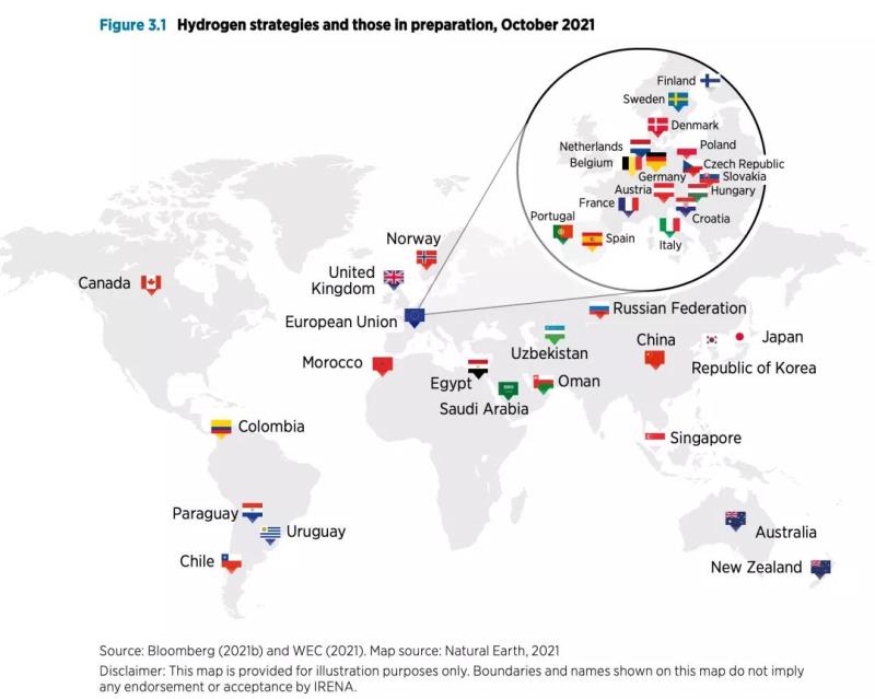 最后,政策和監(jiān)管仍存在許多不確定性。盡管140多個國家承諾在未來幾十年內(nèi)實(shí)現(xiàn)凈零排放,但實(shí)現(xiàn)這些目標(biāo)的速度仍不確定。誠然,2017年只有一個國家(日本)制定了國家氫氣戰(zhàn)略,而今天30多個國家已經(jīng)制定或正在制定氫氣戰(zhàn)略。然而,需要穩(wěn)定的長期政策框架來支持大規(guī)模開發(fā)和部署以及標(biāo)準(zhǔn)和認(rèn)證,因?yàn)楦鲊狈χ贫然瘷C(jī)制來規(guī)范氫氣的生產(chǎn)和消費(fèi)。