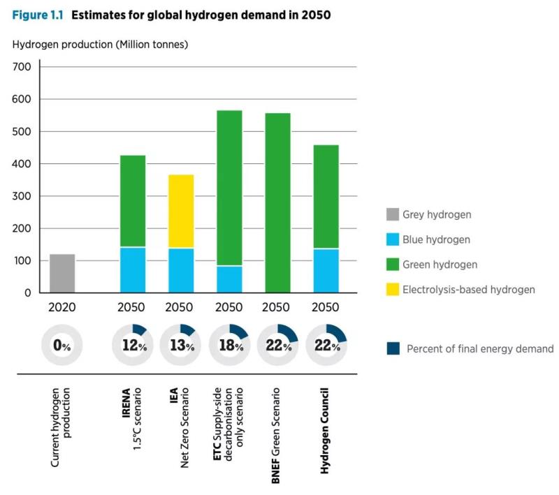 成本確實(shí)是阻礙清潔氫對能源轉(zhuǎn)型做出更大貢獻(xiàn)的主要障礙之一,氫能與化石燃料相比,不僅生產(chǎn)成本高,而且運(yùn)輸、轉(zhuǎn)化和儲存氫氣的成本也高,碳捕獲和儲存(CCS)尚未大規(guī)模部署。此外,脫碳所需的氫價值鏈中的一些技術(shù)的技術(shù)水平仍然在早期,需要大規(guī)模驗(yàn)證。例如,目前還沒有現(xiàn)成的專門使用氫氣的燃?xì)廨啓C(jī)。此外,到2050年用電解槽生產(chǎn)氫氣可能消耗近21000太瓦時(TWh),這幾乎與當(dāng)今全球生產(chǎn)的電力一樣多。因此,隨著越來越多的終端部門實(shí)現(xiàn)電氣化,缺乏足夠的可再生電力可能成為綠色氫氣的瓶頸。