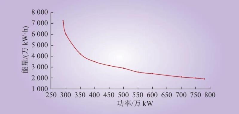 分析解集的規(guī)律,以2021年的計算結(jié)果為例,繪制儲能的功率和能量分析計算結(jié)果,如圖8所示??梢钥吹剑谶_到相同目標的前提下,儲能的能量隨著儲能功率的增加而減少,且減少的趨勢逐步放緩。在功率較小時(初值290萬kW為起點),能量下降斜率較大,當功率達到650萬kW以上時,儲能的能量基本達到平穩(wěn)狀態(tài)。