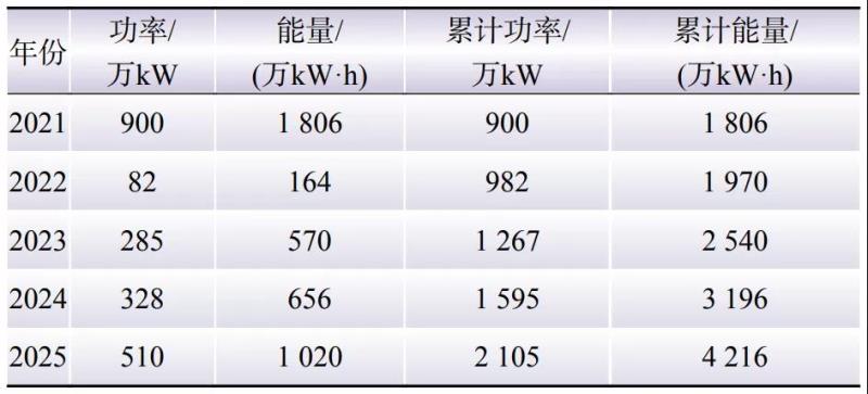 根據(jù)上述方法,開展某省級電力系統(tǒng)配置儲能分析計算。根據(jù)2021—2025年的邊界條件,考慮該系統(tǒng)中需求響應(yīng)占比小于1%,以負荷100%滿足和新能源利用率達到95%為目標,開展“十四五”期間逐年配置儲能的分析計算。