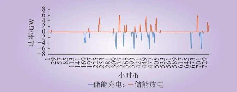 以儲能600萬kW/2 400萬kW·h的配置方案為例,選取典型日繪制系統(tǒng)時序運行曲線和儲能SOC曲線,如圖4、5所示??梢钥吹?,當SOC達到100%,儲能無法繼續(xù)充電,新能源發(fā)生棄電,直到17:00,新能源發(fā)電功率減小,負荷上升,儲能有了放電空間,SOC開始減小,直到22:00儲能電量放完。圖6、7為2021年1月儲能的SOC曲線和儲能充放電功率曲線。