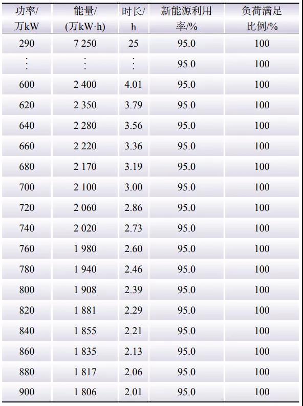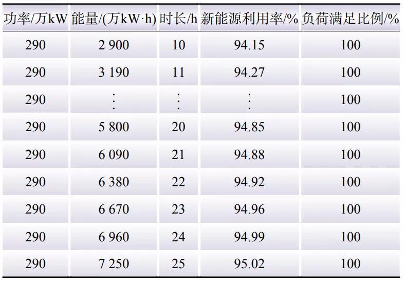 (2)儲能功率初值下的能量計算。在保證電網(wǎng)安全穩(wěn)定運行和供熱要求的前提下,設(shè)置儲能功率初值290萬kW,按40%納入機組組合,能量初值為2900萬kW·h,時序仿真計算得到新能源利用率為94.15%,不滿足利用率要求,進一步增加儲能能量,得到功率初值下,滿足負荷和新能源利用率要求的儲能配置方案為290萬kW、7 250萬kW·h,如表3所示。