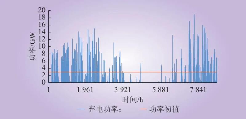 (1)儲能功率初值計算結(jié)果。根據(jù)常規(guī)機組開機時序和新能源出力預(yù)測,以步長1 h,周期8 760 h計算得到不配置儲能時該省級電力系統(tǒng)2021年共預(yù)計發(fā)生206次棄電,如圖3中藍色曲線所示,棄電電量83.7億kW·h,棄電率10.7%。