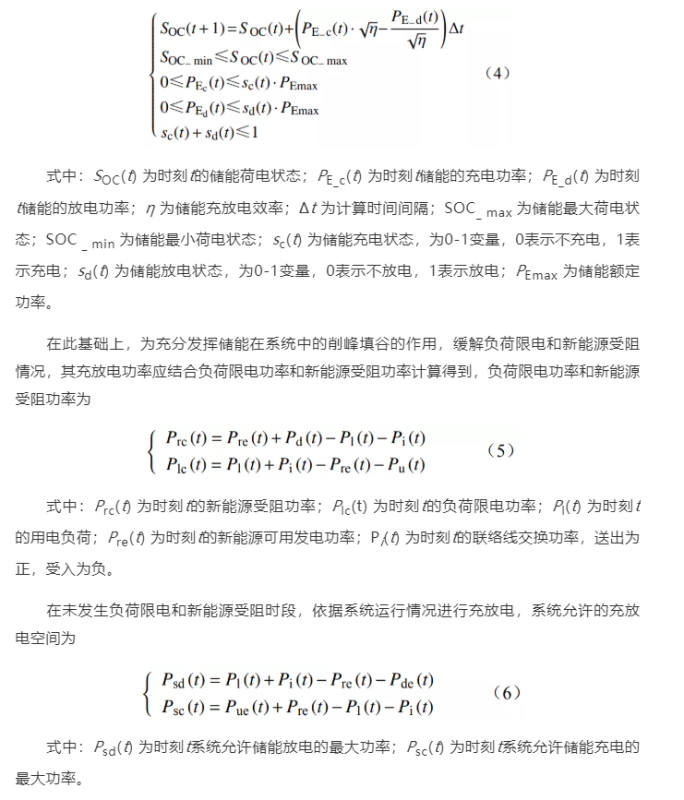 根據(jù)新能源利用率和負荷限電電量要求,結(jié)合儲能充放電策略,計算功率初值對應(yīng)的儲能能量。計算步驟為:①選擇儲能能量初值,可為單次新能源受阻電量和單次負荷限電電量中的最大值;②逐時段計算儲能的充、放電功率。儲能的充放電功率應(yīng)由儲能的荷電狀態(tài)、儲能功率、新能源受阻功率、負荷受限功率及系統(tǒng)允許儲能充放電功率綜合確定;③計算配置儲能后的新能源受阻電量和新能源利用率;④判斷新能源利用率是否滿足要求。新能源利用率小于目標時,增加儲能能量;新能源利用率大于目標時,減少儲能能量,直至滿足新能源利用率目標;判斷平抑的負荷限電電量是否滿足平衡要求,不滿足時,增加儲能能量,直至滿足平衡要求。