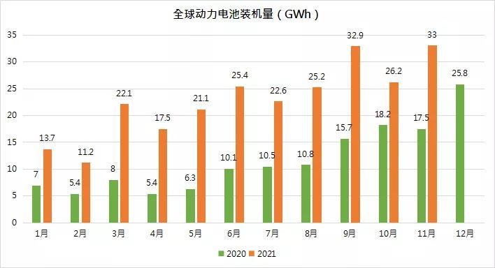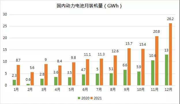 中國儲能網(wǎng)訊:2021年,我國動力電池裝機量154.5GWh,同比增長142.8%。其中12月份裝機量達到26.2GWh,創(chuàng)歷史新高,同比增長102.4%。