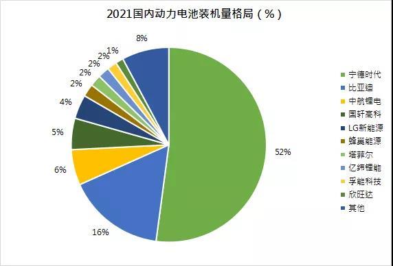 從市場份額來看,寧德時代繼續(xù)保持較大的市場優(yōu)勢,2021年國內(nèi)市場份額 52.1%。其他進入前十的鋰電上市公司有:比亞迪、國軒高科、億緯 鋰能、孚能科技和欣旺達等。