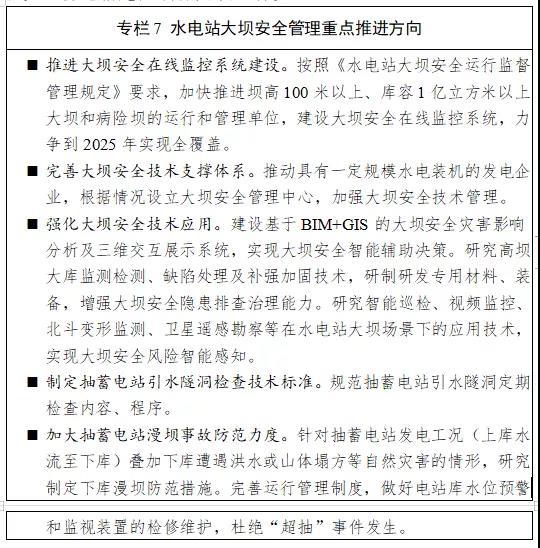 強化水電站大壩安全保障。完善大壩安全法律法規(guī)及技術標準體系,推動大壩安全領域風險分級管控和隱患排查治理雙重預防機制建設,提高水電站大壩運行安全風險管控水平。加強電力企業(yè)隱患自查自改自報的規(guī)范管理。進一步加強電力企業(yè)大壩安全應急管理,不斷完善以大壩安全應急預案建設為重點的電力企業(yè)突發(fā)事件預防與應急準備。進一步發(fā)揮科技引領作用,加大創(chuàng)新力度,推動北斗系統(tǒng)、智能大壩等新技術研發(fā)和推廣應用,促進水電站大壩安全管理新技術的應用。