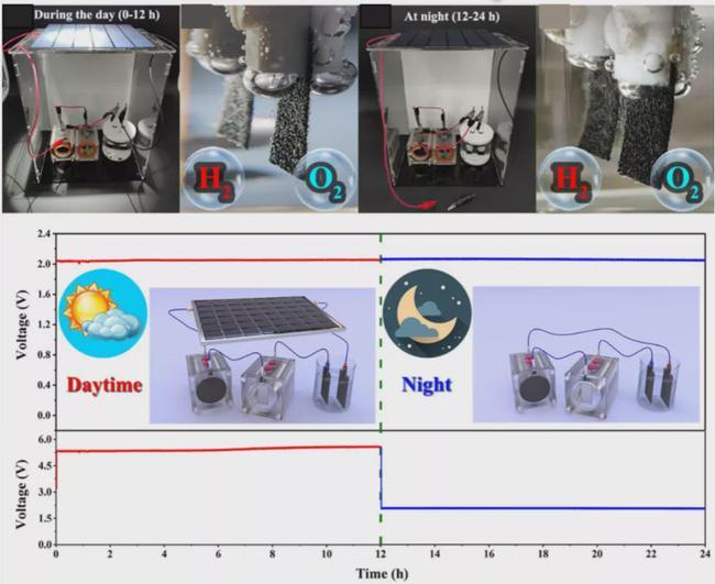 團(tuán)隊(duì)鐘耀棠等構(gòu)建了一種高效低成本的制氫新體系,該體系由太陽能電池板發(fā)電、可充電鋅-空氣電池儲電和電解槽電解水制氫等三部分構(gòu)成。制備出能同時適用于氫析出(HER)、氧析出(OER)與氧還原(ORR)反應(yīng)的非貴金屬催化材料(Co-NC@CC)。實(shí)驗(yàn)結(jié)果表明,所構(gòu)建的電解水制氫系統(tǒng)可實(shí)現(xiàn)24 h無間斷高效穩(wěn)定制氫。在氙燈1500 W/m2光功率密度的照射下,其太陽能-氫轉(zhuǎn)化效率(STH,solar to H2)高達(dá)18.43%,接近低成本吸光材料驅(qū)動電解水產(chǎn)氫體系的最高紀(jì)錄(18.7%)。這種利用太陽能驅(qū)動的新型高效低成本電解水制氫系統(tǒng)實(shí)現(xiàn)了氫能生產(chǎn)清潔化,為制氫技術(shù)的可持續(xù)發(fā)展提供了可靠途徑。成果” Efficient water splitting system enabled by multifunctional platinum-free electrocatalysts”發(fā)表在Adv. Funct. Mater. 2021, 31, 2009853上。