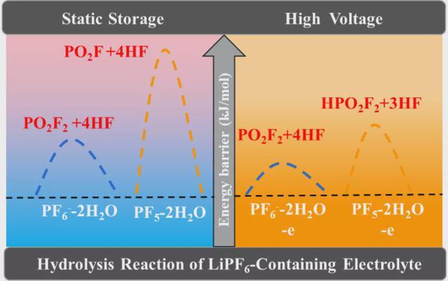團(tuán)隊(duì)邢麗丹教授、劉明珠等提出了鋰離子電池中氫氟酸(HF)產(chǎn)生的新機(jī)理。在鋰離子電池的使用過程中,含有LiPF6的電解液會發(fā)生水解反應(yīng),產(chǎn)生HF。HF會進(jìn)一步腐蝕電極/電解液界面膜,進(jìn)而導(dǎo)致電池性能下降。然而,商用電解液的水解機(jī)理并不明確,導(dǎo)致抑制電解液水解的研究進(jìn)展緩慢。該團(tuán)隊(duì)利用分子動力學(xué)模擬,量子化學(xué)計算和實(shí)驗(yàn)研究相結(jié)合,闡明了電解液的水解機(jī)制,并提出了抑制水解反應(yīng)的解決方案。該成果“Hydrolysis of LiPF6?Containing Electrolyte at High Voltage” 發(fā)表在ACS Energy Lett. 2021, 6, 2096-2102上。