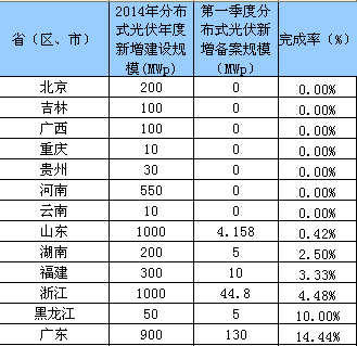 山東作為分布式光伏發(fā)展大省,2014年第一季度新增分布式備案容量僅0.415萬千瓦,約占年度規(guī)模的0.42%。此外,浙江省2014年度分布式光伏建設(shè)指導(dǎo)規(guī)模為100萬千瓦,而第一季度僅新增備案4.48萬千瓦;廣東第一季度分布式光伏建設(shè)情況較好,但新增備案容量也僅有13萬千瓦。(具體情況見下表)。