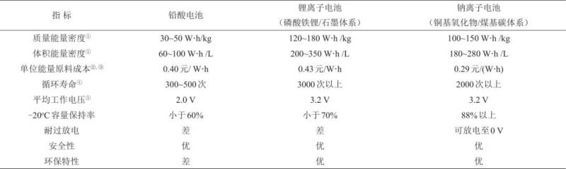 表1 鉛酸電池、鋰離子電池和鈉離子電池性能對(duì)比
