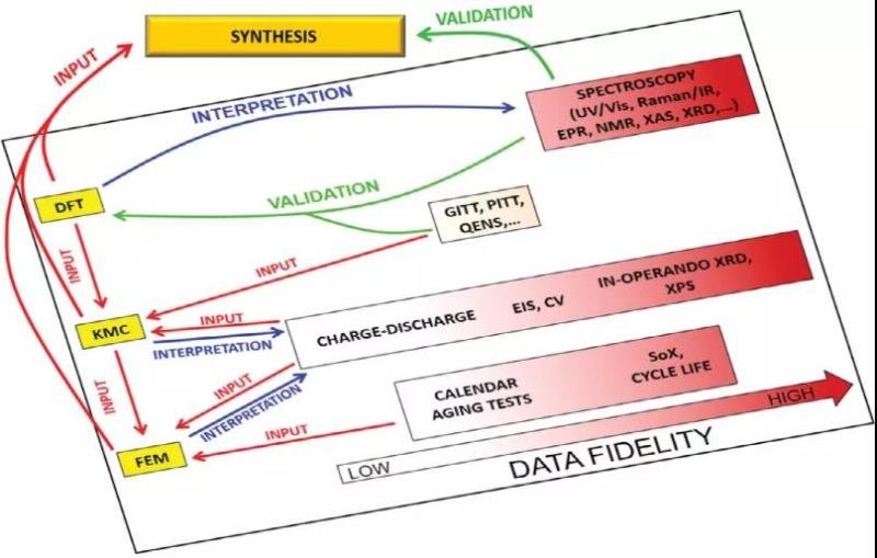 圖4. 研究電池接口的代表性實(shí)驗(yàn)方法和理論方法之間的數(shù)據(jù)流示意圖。每種方法的保真度通常與其成本成正比,但只有在給定的方法/數(shù)據(jù)最有價(jià)值時(shí)才能通過(guò)獲取數(shù)據(jù)來(lái)優(yōu)化保真度-成本關(guān)系。