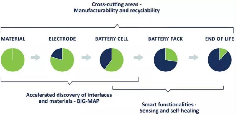 從長(zhǎng)遠(yuǎn)來(lái)看,即 10 年或更長(zhǎng)時(shí)間,預(yù)計(jì)該方法將完全成熟,通過(guò)集成電池設(shè)計(jì)和制造設(shè)計(jì)子循環(huán)、與 BIG-MAP 和智能功能的結(jié)果接口來(lái)關(guān)閉循環(huán)(傳感器和自我修復(fù))形成一個(gè)完全自主的系統(tǒng)(使用 AI)(見圖 11)。此外,該方法的某些部分可以逐步提供給行業(yè),在完整的包裝成為一種新的技術(shù)狀態(tài)的商品之前