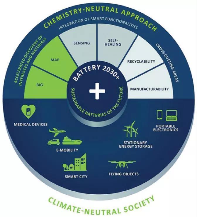 歐洲目前正在創(chuàng)建一個(gè)強(qiáng)大的電池研究和創(chuàng)新生態(tài)系統(tǒng)社區(qū),其中 BATTERY 2030+ 可以為未來(lái)電池技術(shù)的長(zhǎng)期研究提供路線圖。LIB 仍然主導(dǎo)著高能量密度可充電電池的市場(chǎng)。然而,盡管新一代 LIB 即將問世,但當(dāng)前一代 LIB 正在接近其性能極限。向零碳排放社會(huì)的過(guò)渡要求開發(fā)在能量和功率密度方面具有更高性能的電池。未來(lái)的電池必須具有更好的生態(tài)足跡。它們將具有出色的使用壽命和可靠性以及增強(qiáng)的安全性和環(huán)境可持續(xù)性。這很可能要求電池接近其理論極限。