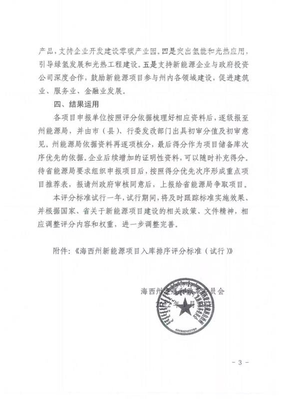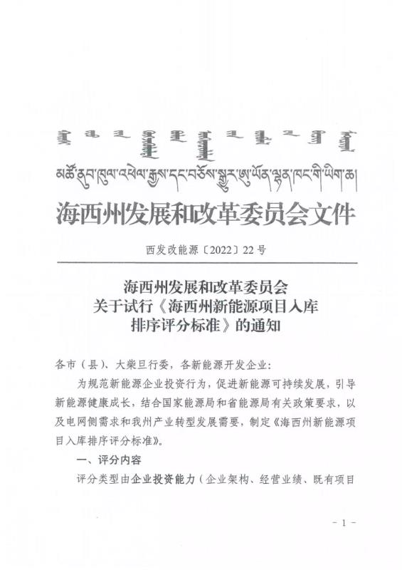 中國儲能網(wǎng)訊:1月19日,青海海西州發(fā)改委印發(fā)《新能源項(xiàng)目入庫排序評分標(biāo)準(zhǔn)》,通過八大類35小項(xiàng)的評分類型對新能源項(xiàng)目進(jìn)行評分排序。