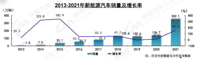 2021年,在全球疫情的影響下,我國新能源汽車產(chǎn)銷量依然呈爆發(fā)式增長。中汽協(xié)數(shù)據(jù)顯示,2021年,我國新能源汽車銷量352.1萬輛,同比增長1.6倍,連續(xù)7年位居全球第一,市場(chǎng)占有率達(dá)到13.4%,高于上年8個(gè)百分點(diǎn)。