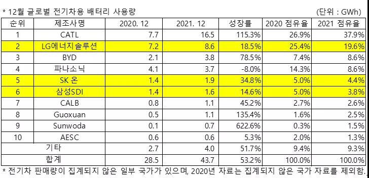中國(guó)儲(chǔ)能網(wǎng)訊:2月7日,韓國(guó)市場(chǎng)研究機(jī)構(gòu)SNE Research發(fā)布2021年全球動(dòng)力電池裝機(jī)量排行榜。2021年全球動(dòng)力電池裝機(jī)量前十名分別為:寧德時(shí)代、LG新能源、松下、比亞迪、SK On、三星SDI、中創(chuàng)新航(中航鋰電)、國(guó)軒高科、遠(yuǎn)景動(dòng)力、蜂巢能源。