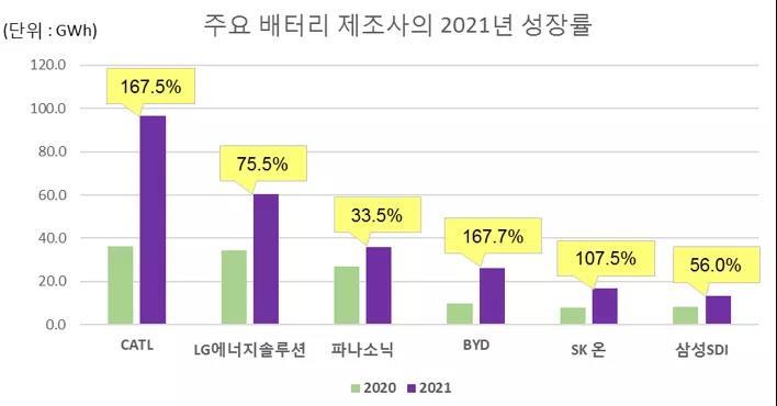 6家中資企業(yè)之中,除了以配套國(guó)際車企為主的遠(yuǎn)景動(dòng)力以外另外五家公司的增速均超過100%。其中,寧德時(shí)代和比亞迪的電池裝機(jī)量同比增長(zhǎng)超過167%,蜂巢能源裝機(jī)量同比增長(zhǎng)430%以上。