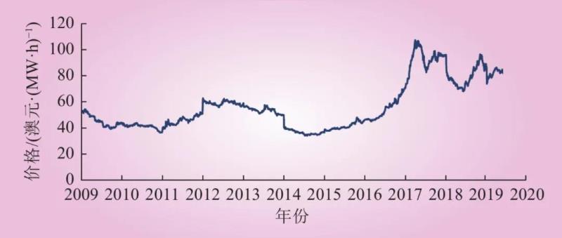 2009—2019年NSW基荷期貨結(jié)算價(jià)格變化情況如圖2所示??梢钥闯?,期貨價(jià)格基本上反映了2015年以后澳大利亞大量建設(shè)風(fēng)光等新能源帶來的電價(jià)上漲趨勢。這表明澳大利亞的期貨市場有助于實(shí)現(xiàn)其中遠(yuǎn)期價(jià)格發(fā)現(xiàn)的功能。