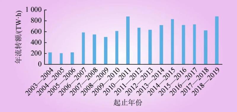根據(jù)IEA和AFMA的數(shù)據(jù),2018—2019年,澳大利亞場內(nèi)交易的電力期貨達(dá)到891 829 GW?h,是現(xiàn)貨市場體量的3.5倍。圖1是2003—2019年AFMA統(tǒng)計(jì)的電力期貨合約年度流轉(zhuǎn)額,可以反映出期貨的流動(dòng)性良好,呈現(xiàn)較穩(wěn)定的增長趨勢。
